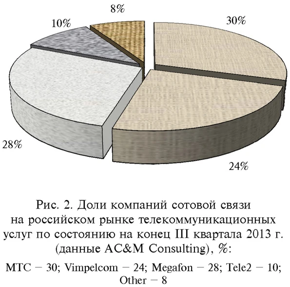 Отрасль сотовой связи. После определения ключевых показателей для анализа факторов, влияющих на инвестиционную привлекательность компаний, необходимо изучить выбранную для анализа отрасль — отрасль сотовой связи. Это является важным моментом, так как отраслевые особенности способны повлиять на анализ инвестиционной привлекательности. Услуги сотовых операторов пользуются наибольшим спросом среди всего российского телекоммуникационного рынка. Российский рынок сотовой связи можно назвать олигополистическим, так как уже на протяжении многих лет он представлен несколькими ведущими операторами ОАО — Мобильные ТелеСистемы (МТС), МегаФон, ВымпелКом и Теле2. По последним открытым данным сайта консалтинговой компании AC&M Consulting рассмотрена деятельность данных компаний за III квартал 2013 г. Общее число пользователей SIM-карт (активных) в России составляет 239,5 млн, что превышает аналогичный показатель в конце III квартала 2012 г. на 9,7 млн пользователей. Распространение по стране выросло с 160,9 до 167,7 %. Каждый год эти цифры растут, что свидетельствует о все большей популярности и развитии сотовой связи в стране. Доли операторов на рынке по количеству абонентов не подвергались серьезным изменениям уже с 2005 г., а количество абонентов и выручка компаний с каждым годом увеличиваются, что говорит о том, что компании стремятся к укреплению своих позиций и поддержанию конкурентоспособности. ![]() На рис. 2 показано, что по состоянию на конец III квартала 2013 г. лидером по числу пользователей в России является компания МТС — 73,2 млн, чья доля среди всех операторов составляет 30 %, далее — МегаФон с количеством пользователей 66,3 млн и долей рынка 28 %, у ВымпелКома 58,1 млн пользователей и доля 24 %, у Теле2 23,6 млн, что составляет около 10 % от всех пользователей. Для того чтобы каждой из рассмотренных компаний поддерживать свой уровень конкурентоспособности и занимаемое положение на рынке, необходима постоянная грамотная работа владельцев бизнеса и менеджеров. Требуется привлечение нового капитала и инвесторов. Компаниям необходимо не только поддержание своего престижа и своей доли рынка, но и получение выгоды от своей деятельности, т. е. каждая компания каждый год должна стремится увеличить свою прибыль, в том числе и экономическую. Экономическая добавленная стоимостьДля анализа деятельности компаний и определения их инвестиционной привлекательности выберем одну из моделей, основанных на экономической прибыли — экономическую добавленную стоимость (EVA). Показатель экономической добавленной стоимости — EVA (economic value added) занимает лидирующие позиции среди относительно новых метрических систем. Он сочетает в себе данные баланса, отчета о прибылях и убытках, а также альтернативные издержки капитала. Выбор данного показателя обосновывается следующим. Во-первых, экономическая добавленная стоимость является одним из наиболее известных и употребляемых в практике показателей, который опирается на анализ и управление стоимостью предприятия. Во-вторых, у компаний на российском рынке, которые стремятся перейти к использованию подобных подходов, данная модель в настоящий момент вызывает пристальный интерес. Но несмотря на зарубежный опыт по применению EVA, использование данного подхода в России не так развито, по этой причине разбор метода экономической добав