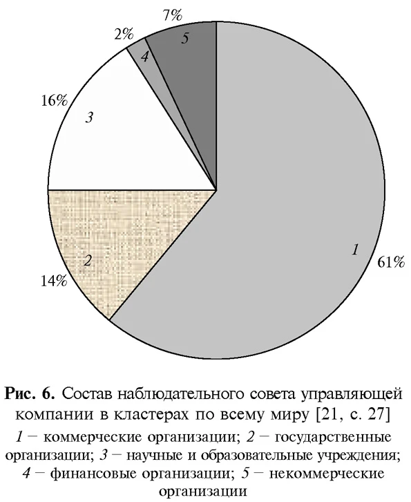 Сравнительный анализ организационных структур систем управления инновационными кластерами в РоссииСостав участников кластера, как правило, формируется по территориальному и отраслевому признаку, а процесс входа и выхода участников имеет юридическое оформление. Менеджмент управляющей компании фокусируется на активизации взаимодействий участников кластера в целях разработки и реализации совместных проектов, на представлении интересов резидентов кластера в органах власти, институтах развития и т. д. [17, c. 249—250]. Доля кластеров, имеющих юридическое лицо, по всему миру составляет примерно 65 % [21, с. 26]. Управляющая компания является органом оперативного управления, что предполагает наличие сотрудников, для которых развитие кластера является основной должностной обязанностью. Управляющая компания требует также финансирования, в то время как совет кластера, как правило, функционирует на безвозмездных началах. Важным признаком управляющей компании является персональная ответственность за развитие кластера и его определенных направлений или проектов, закрепленная за руководством и сотрудниками. Как правило, роль управляющей компании в российских инновационных кластерах исполняют «региональные институты развития». Однако в ряде случаев ответственность за развитие кластеров возлагается на центры кластерного развития, создаваемые по программе поддержки малого и среднего предпринимательства [17]. Складывающиеся в Российской Федерации организационные структуры систем управления кластерами находятся на начальном этапе своего формирования. Они характеризуется большим количеством управляющих субъектов, сферы компетенций которых недостаточно четко определены и, как правило, пересекаются. К ним относятся [1]: