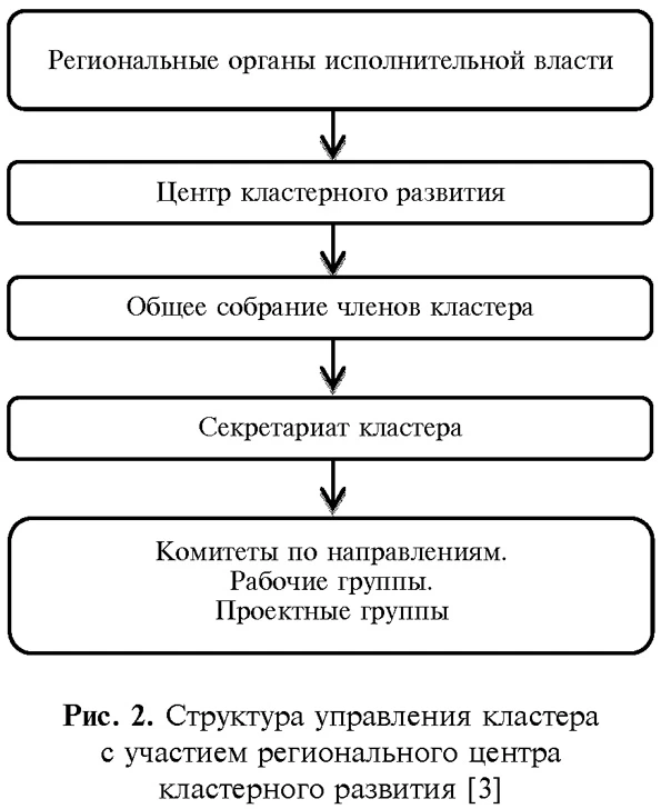 Структура управления данными кластерами включает исполнительное и консультативное звенья. Прямое управление кластером осуществляется советом кластера, под которым понимают коллегиальный орган федерального уровня, осуществляющий управление кластером в стратегической перспективе и создаваемый с участием представителя федеральной исполнительной власти, который является председателем данного совета. Оперативное управление осуществляется секретариатом кластера, который формируется советом кластера для выполнения функций управляющей компании на период до начала ее создания. В структуре управления кластером присутствует совещательный орган — экспертный совет, который формируется из представителей основных участников кластера, представителей региональных и федеральных органов власти, представителей государственных заказчиков. Непосредственным управлением проектами в рамках кластера занимается проектный офис. Имеет место и другой тип управления кластерами, построенный на создании регионального центра кластерного развития (рис. 2).