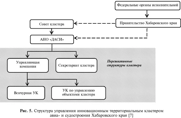 Структура системы управления Архангельским кластером во многом схожа со структурой управления Самарским аэрокосмическим кластером. Однако в данной структуре организация-координатор является исполнительным органом, а не субъектом управления. В ее рамках, на наш взгляд, на перспективу необходимо трансформировать организацию-координатор в управляющую компанию с соответствующими организационными изменениями, полномочиями и ответственностью. Определенный интерес для развития систем управления инновационными кластерами представляет опыт Хабаровского кластера авиа- и судостроения, система управления которого имеет уникальный вид (рис. 5).
