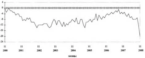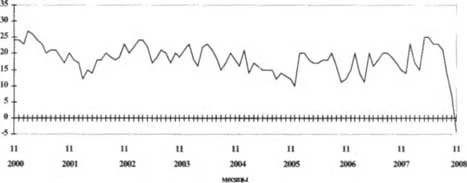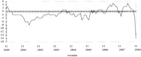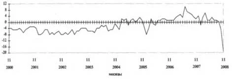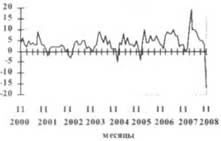 В результате снижения основных показателей деятельности базовых промышленных организаций в ноябре 2008 г. в данном секторе экономики резко уменьшилась величина индекса предпринимательской уверенности (рассчитывается как среднеарифметическое значение балансов по фактически сложившемуся уровню спроса, текущим запасам готовой продукции (с обратным знаком) и ожидаемой тенденции выпуска, в процентах (сезонность исключена). Баланс - разность долей респондентов, отметивших увеличение и зтиень-шение показателя по сравнению с предыдущим месяцем, или разность долей респондентов, отметивших уровень показателя как «выше нормального» и «ниже нормального» в отчетном месяце, в процентах). По сравнению с октябрем 2008 г. индекс уверенности снизился на 12 процентных пунктов, а по сравнению с ноябрем 2007 г. - на 16 и составил -16% (график 1). График I Динамика индекса предпринимательской уверенности базовых организаций обрабатывающих, добывающих производств и электроэнергетики (балансы, %)
