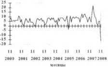 В ноябре 2008 г. снизились инфляционные ожидания руководителей базовых промышленных организаций. Рост цен на реализуемую продукцию в ближайшей перспективе прогнозировали 24% респондентов против 32% в октябре 2008 г. Важную роль в этом сыграло снижение инфляционных ожиданий предпринимателей относительно роста цен на сырье и материалы, а также возможное снижение потребительского спроса. Чаще, чем в целом по совокупности базовых организаций, рост цен реализации ожидают руководители промышленных организаций, производящих резиновые и пластмассовые изделия; транспортные средства и оборудование; производящих пищевые продукты, включая напитки, и табак. Финансово-экономическое положениеОценки предпринимателями финансового положения базовых промышленных организаций в ноябре 2008 г. резко ухудшились. Баланс оценок показателя составил -19% против -5% в октябре 2008 г. и +2% в ноябре 2007 г. (график 7). Ежемесячные балансы оценок данного показателя с июня 2006 г., за исключением января и октября 2008 г., были положительными. Наиболее пессимистично сложившуюся ситуацию с финансовым обеспечением охарактеризовали руководители базовых организаций, добывающих полезные ископаемые, кроме топливно-энергетических; производящих кокс и нефтепродукты; организаций металлургического производства и производства готовых металлических изделий. Сложившаяся ситуация с финансовым положением базовых промышленных организаций в ноябре 2008 г. в значительной мере обусловлена снижением оценок изменения прибыли. График 7 Динамика оценки изменения обеспеченности базовых организаций обрабатывающих, добывающих производств и электроэнергетики собственными финансовыми средствами (балансы, %)