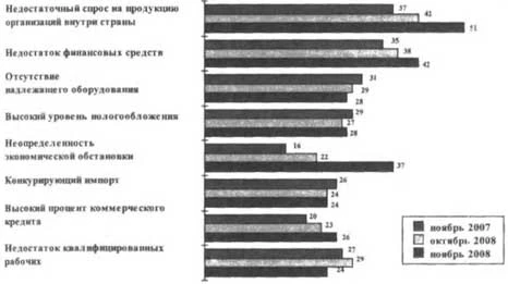 Чаще влияние данного фактора отмечалось руководителями организаций, производящих прочие неметаллические минеральные продукты (69%); добывающих полезные ископаемые, кроме топливно-энергетических (68%); организаций текстильного и швейного производства (64%). Усилилось отрицательное воздействие на деятельность базовых промышленных организаций фактора «недостаток финансовых средств». В целом на него указали 42% респондентов, что на 7 процентных пунктов больше, чем год назад, и на 4 - чем в октябре 2008 г. Наибольшее проявление данного фактора отмечалось в текстильном и швейном производстве (60%), в организациях, обрабатывающих древесину и производящих изделия из дерева (51%). Значительная часть (28%) руководителей базовых организаций в ноябре текущего года продолжала ссылаться на «высокий уровень налогообложения». Чаще негативное влияние данного фактора отмечали руководители промышленных организаций, производящих кожу, изделия из нее и обувь (50%). Сохранилось отрицательное влияние фактора «конкурирующий импорт». В ноябре 2008 г. на него указали 24% респондентов, прежде всего руководители организаций текстильного и швейного производства и организаций, производящих кожу, изделия из нее и обувь. Усиливается негативное воздействие на деятельность базовых промышленных организаций фактора «высокий процент коммерческого кредита». В ноябре 2008 г. его отметили 26% организаций против 20% в аналогичном периоде 2007 г. Однако наибольший рост числа негативных оценок у руководителей базовых промышленных организаций получил в ноябре 2008 г. фактор «неопределенность экономической обстановки». Его распространенность возросла относительно ноября 2007 г. на 21 процентный пункт, а относительно же октября 2008 г. - на 15 (37% обследованных организаций). Одновременно уменьшилась с 12% в ноябре 2007 г. до 7% в ноябре 2008 г. доля базовых промышленных организаций, которые, по оценкам их руководителей, не испытывают воздействия ограничивающих факторов. Эта негативная ситуация проявилась впервые за последние годы. Ожидания предпринимателей на ближайшие три-четыре месяца по большинству показателей производственной деятельности базовых промышленных организаций в ноябре 2008 г. были самыми пессимистичными за все время проведения обследований с 1995 г. При этом ожидания по такому показателю, как обеспеченность собственными финансовыми средствами, впервые за рассматриваемый период перешли в «отрицательную» плоскость. Результаты выборочного опроса руководителей базовых промышленных организаций показывают, что в промышленном производстве в ноябре 2008 г. отмечены существенные отрицательные тенденции в виде снижения ряда основных производственных показателей. Причем наиболее сильное обострение ситуации, по оценкам хозяйственников, наблюдается в снижении спроса на промышленную продукцию, сокращении финансовых средств и неопределенности экономической обстановки.