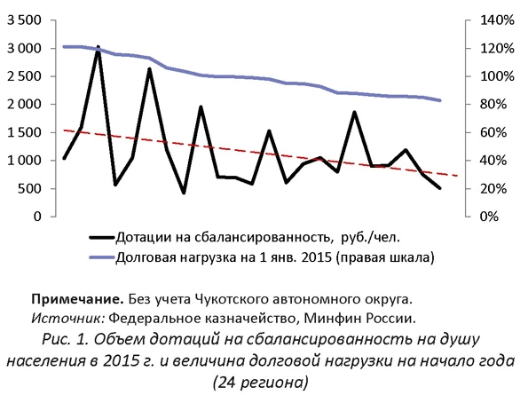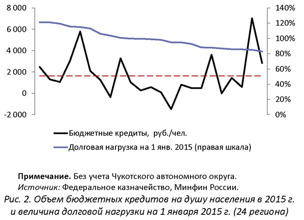Рис. 1 и 2 в более наглядной форме демонстрируют отсутствие четкой зависимости объема (на душу населения) переданных средств от долговой нагрузки регионов по состоянию на начало года (в группе регионов с высокой долей долговой нагрузки - более 80%).