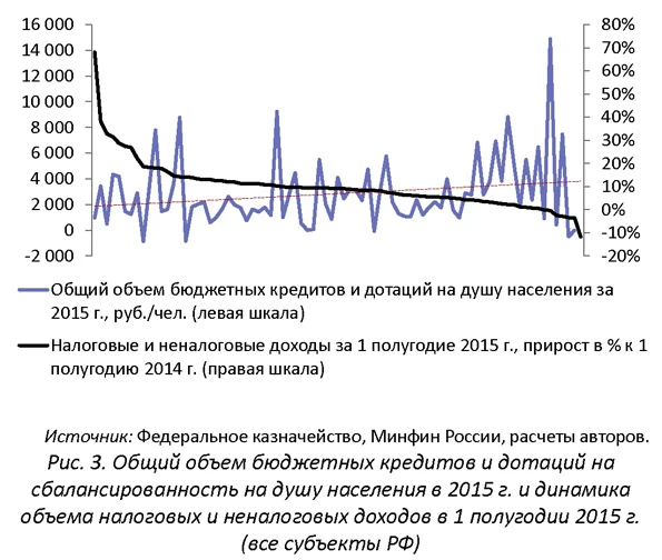 Далее был проведен анализ зависимости распределения бюджетных кредитов и дотаций на сбалансированность в 2015 г. в зависимости от динамики налоговых и неналоговых доходов субъектов РФ в 1-м полугодии 2015 г. относительно аналогичного периода 2014 г. (см. рис. 3). Мы задались вопросом о том, действительно ли через межбюджетные инструменты оперативной финансовой поддержки оказывалась помощь в первую очередь регионам, столкнувшимся с проблемами в доходной части своих бюджетов в течение года3. Нижеприведенный график показывает, что динамика налоговых и неналоговых доходов региональных бюджетов в 1-м полугодии по всей видимости не являлась основным индикатором, на который ориентировался Минфин России при выделении дополнительных объемов финансовой помощи.