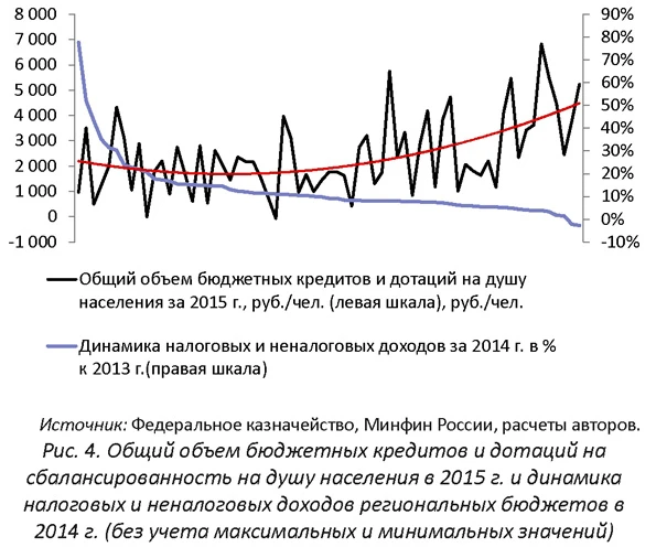 Дополнительно был рассмотрен вопрос о том, что на объемы дополнительной помощи (бюджетных кредитов и дотаций на сбалансированность) в течение 2015 г. в большей степени влияла динамика налоговых и неналоговых доходов региональных бюджетов по итогам предыдущего 2014 г. (к уровню 2013 г., см. рис. 4). Если исключить субъекты РФ с максимальными и минимальными значениями по рассматриваемым показателям, то на рисунке можно увидеть определенную закономерность: по мере снижения темпа прироста налоговых и неналоговых доходов в 2014 г. в среднем несколько увеличивается общий объем (на душу населения) «оперативной» финансовой помощи по итогам уже 2015 г. Тем не менее наблюдается значительный разброс значений объемов бюджетных кредитов и дотаций на сбалансированность. В результате можно говорить о том, что другие факторы оказывали не меньшее, и даже большее влияние при определении объемов дополнительной финансовой помощи.