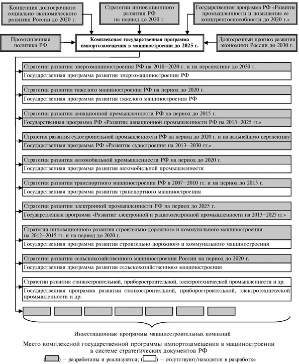 Комплексная программа импортозамещения должна исходить не из адаптации машиностроения к условиям внешней среды, а из системы целевых установок перспективного развития, включающей в себя устойчивый (инвариантный) комплекс целевых индикаторов, характеризующих уровень такого развития. Ее формирование обусловлено требованием времени и необходимыми условиями стратегического планирования, отраженными в системе реализации Концепции долгосрочного социально-экономического развития России до 2020 г., Стратегии инновационного развития РФ на период до 2020 г. и Государственной программе РФ «Развитие промышленности и повышение ее конкурентоспособности на период до 2020 года». Основной упор в разработке программы должен быть сделан на максимальном учете новых тенденций в развитии мирового машиностроения, выражающихся, к примеру, в появлении новых производственных технологий и других вызовов времени [12]. Государственная программа не должна заменять собой уже разработанные и используемые программы (генеральные схемы, стратегии) развития подотраслей машиностроения. В ней должны быть заданы преимущественно приоритеты и ориентиры, с которыми должны согласовываться другие стратегические документы РФ (см. рисунок).