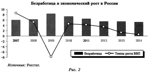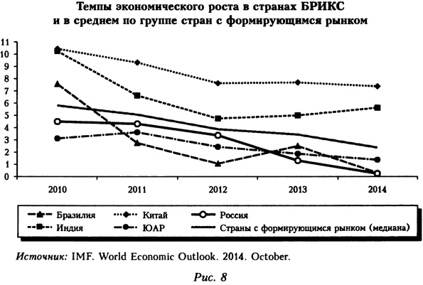 Подчеркнем, что в рассматриваемом периоде динамика российских экономических показателей следовала общему с другими странами с формирующимся рынком тренду (рис. 8). В странах этой группы завершилось активное посткризисное восстановление, темпы экономического роста замедлились. Торможение роста наблюдалось во всех странах БРИКС: в Китае рост ВВП с 10,4% в 2010 г. упал до 7,7% в 2013 г.; в Индии — с 10,3 до 4,4%; в Бразилии — с 7,5 до 2,3%. В среднем по группе стран с формирующимся рынком темп экономического роста снизился с 5,8% в 2010 г. до 3,4% в 2013 г.