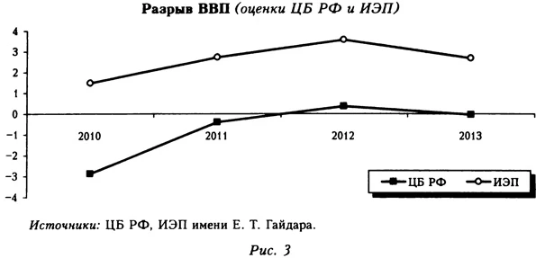 Традиционным индикатором фазы экономического цикла выступает так называемый производственный разрыв (разрыв ВВП, output gap)29. В развитых странах на регулярной основе оценивают его величину и используют как ориентир для денежной политики. В России эту практику стали внедрять относительно недавно. Оценки производственного разрыва, представленные Банком России в докладе о денежно-кредитной политике (Банк России, 2014b), свидетельствуют о том, что в 2010 г. экономика быстро восстанавливалась и возвращалась на потенциальный уровень, а в 2011-2013 гг. отклонение ВВП от него было близко к нулю (рис. 3). Другими словами, замедление экономического роста было структурным.