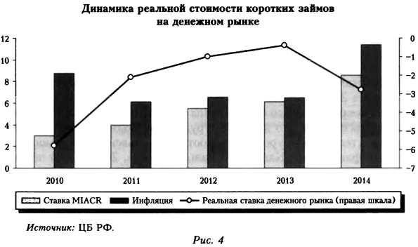 Экономисты из Института Гайдара оценили динамику производственного разрыва с учетом так называемой «внешнеторговой» составляющей30. Полученные оценки подтверждают наличие значительного «перегрева» в 2011-2013 гг., что согласуется с чрезвычайно низкой безработицей в этот период. Тогда низкие темпы экономического роста следует интерпретировать как замедление, связанное с исчерпанием возможностей роста в условиях полной загрузки мощностей. Если опираться на эти показатели, то можно заключить, что в указанном периоде политика монетарной экспансии была бы ошибочной, поскольку экономика находилась не в стадии спада, а скорее наоборот. Отметим, что существует альтернативный взгляд на природу торможения в 2010-2013 гг. Причина кажущегося парадоксальным сочетания сокращающейся безработицы при стагнирующем росте может заключаться в том, что на рынке труда происходил так называемый «дрейф естественного уровня безработицы», объясняемый демографическими факторами (Капелюшников, Ощепков, 2014). Этот эффект выражается в том, что по мере изменения половозрастной структуры населения меняется уровень безработицы, соответствующий состоянию полной занятости31. В последние годы в совокупной рабочей силе увеличилась доля половозрастных групп населения, для которых характерна высокая экономическая активность. В результате подобных структурных изменений естественная норма безработицы сместилась из диапазона 6-7%, где она находилась в докризисный период, в диапазон 5-6%, то есть сокращение безработицы, наблюдаемое после 2009 г., в значительной степени обусловлено структурными факторами. Если принять во внимание этот эффект, то можно прийти к выводу, что рекордно низкая безработица в 2012 и 2013 гг. не обязательно отражает сильный «перегрев» на рынке труда32, а значит, имело место циклическое замедление. Включив эффект дрейфа естественной нормы безработицы в свои расчеты, экономисты из ЦМАКП получили оценки производственного разрыва, согласно которым в течение 2010-2013 гг. экономика России находилась в глубоком циклическом спаде (Апокин и др., 2014). Какой была политика Банка России в это время? Анализ динамики реальных ставок российского денежного рынка показывает, что в посткризисный период они постепенно повышались — с -5,8% в 2010 г. до -0,4% по итогам 2013 г. (рис. 4). Большое отрицательное среднегодовое значение реальной ставки в 2010 г. объяснялось тем, что номинальная ставка межбанковского рынка была низкой в течение всего года и находилась около нижней границы процентного коридора ЦБ РФ, составив 3% в среднем за год, а инфляция по итогам 2010 г. была зафиксирована на уровне 8,8%. По мере увеличения так называемого «структурного дефицита»33 ликвидности и сужения процентного коридора ЦБ РФ ставка денежного рынка росла, а инфляция снижалась, что в итоге привело к росту реальной ставки. В 2014 г. реальная ставка денежного рынка снизилась до — 2,8%.