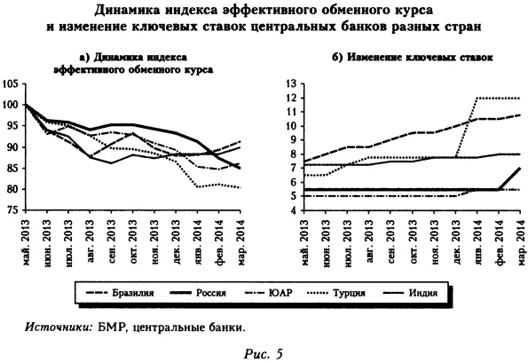 Турбулентный период начался во II квартале 2013 г., когда российский рубль одновременно с валютами других стран с формирующимся рынком оказался под давлением. Его причиной стала волна оттока капитала, вызванная завершением сверхмягкой денежной политики в США. В мае 2013 г. руководство ФРС объявило, что в скором времени планирует приступить к постепенному выходу из программы «количественного смягчения», а с января 2014 г. объем покупки казначейских облигаций начал ежемесячно сокращаться. В результате оттока капитала из развивающихся стран их валюты стали испытывать сильное понижательное давление (см.: BIS, 2014; Nechio, 2014; IMF, 2014). Центральные банки оказались в сложном положении: им пришлось выбирать между поддержанием экономического роста, с одной стороны, и контролем над инфляцией и противодействием ослаблению национальной валюты — с другой. Поддержание экономической активности, сокращающейся под влиянием оттока капитала, требовало от денежных властей монетарной экспансии. Но она привела бы к усилению девальвационного давления и значительному падению обменного курса национальной валюты, следствием чего могли стать дестабилизация финансового сектора, вызванная ростом стоимости обслуживания внешних займов, а также ускорение инфляции из-за увеличения цен импортных товаров. Альтернативой такому выбору было сдерживание оттока капитала и обесценения национальной валюты, обеспеченное комбинацией валютных интервенций и повышения учетной ставки. Такие действия неминуемо привели бы к потере валютных резервов и денежному сжатию, что, в свою очередь, угрожало значительным падением темпов экономического роста. Центральные банки Индии, Турции, ЮАР, Бразилии и России предпочли промежуточный вариант. В итоге за период с мая 2013 по апрель 2014 г. в ряде стран обменный курс национальной валюты заметно снизился на фоне ограниченных интервенций и повышения ключевых ставок (рис. 5).