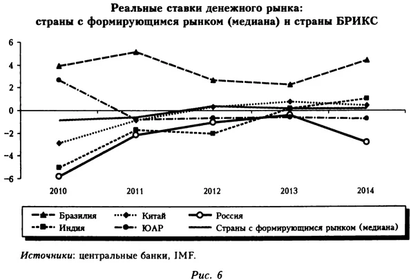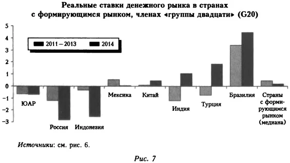 Источники: см. рис. 6. К аналогичному заключению можно прийти, если посмотреть, какое место по стоимости кредитов на денежном рынке занимает Россия среди стран с формирующимся рынком из «группы двадцати» и стран БРИКС (рис. 6-7). По отношению к сопоставимым странам в рассматриваемом периоде в России не наблюдалось ни избытка, ни недостатка ликвидности. Среднее значение реальной ставки в 2014 г. было заметно выше в Индии и Бразилии (1,0 и 4,5% соответственно — см. таблицу), где также произошло значительное торможение экономического роста. При этом в ЮАР реальная ставка денежного рынка была отрицательной (-0,7°о), а в Аргентине и Венесуэле на фоне галопирующей инфляции ставки были намного ниже (-14,8 и -43,5% соответственно), что свидетельствует не о высокой доступности кредита, а о разрушении нормального механизма денежного обращения.