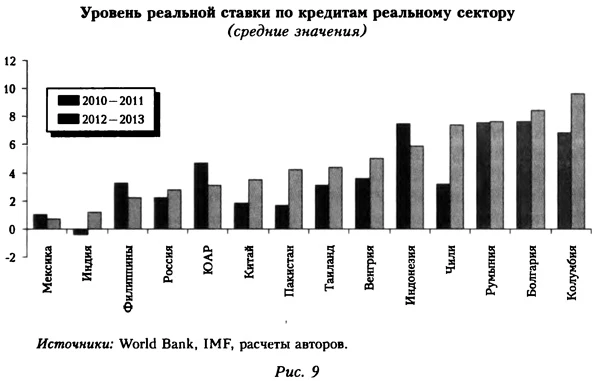 Реальные ставки кредитования нефинансового сектора экономикиПолитику Банка России часто критикуют за то, что она не обеспечивает условия, при которых предприятия реального сектора могли бы получить доступные кредиты, а значит, искусственно тормозит экономический рост. Данный тезис, помимо всего прочего, основан на утверждении об исключительно высокой стоимости кредитов для конечных заемщиков в России. Мы не рассматриваем вопрос о том, должен ли регулятор в условиях несовершенств рынка и низкой конкуренции в финансовом секторе намеренно удерживать ставки межбанковского рынка на заниженном уровне. Вызывает сомнение сама возможность обеспечить умеренные реальные ставки для конечных заемщиков в долгосрочной перспективе при помощи инструментов денежной политики. Так или иначе, утверждение о неприемлемо высокой стоимости кредитов в России не подтверждается, если сравнивать ситуацию в России и других странах с формирующимся рынком. Опираясь на данные о номинальных ставках кредитования, предоставленных Всемирным банком, и сделав поправку на инфляцию, мы получили сопоставимые показатели реальной стоимости кредита для предприятий нефинансового сектора (рис. 9). Анализ показывает, что ставки, по которым российские предприятия занимали у банков, были вполне умеренными. Распределение ставок по кредитам реальному сектору среди стран с формирующимся рынком в посткризисном периоде говорит о том, что по стоимости заимствований Россия находилась в нижней трети списка. Таким образом, утверждение о хронически высокой стоимости кредита в российской экономике не подтверждается.