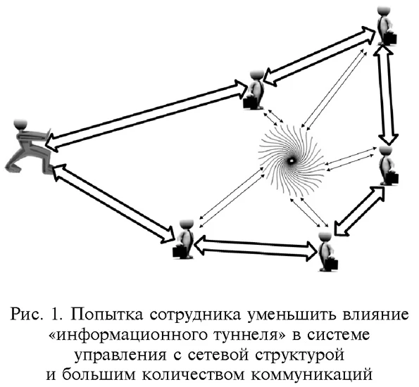 Айрапетова А.Г. В многоуровневых управленческих потоках информации неизбежны потоки, не имеющие чрезвычайно новой или важной информации. Объемы информации, переданной через сети, постоянно растут. Обсуждение проблем этой информации сжато и входит в производственные циклы на предприятии. Информационные технологии используются вместе с традиционными административными функциями для того, «чтобы усилить» их, а также чтобы оптимизировать эти функции на прикладном уровне. Поэтому введение новейших технических средств и модели обработки происходят, как правило, неравномерно, скачками и даже сопровождаются краткосрочными известными рецес-сиями. Рецессии во введении вызваны недостаточной подготовкой персонала, неспособностью управления заинтересовать сотрудников (исполнителей), чтобы изучить последнее программное обеспечение, создать атмосферу для развития менторства и поощрить горизонтальные коммуникации [3]. Затраты времени независимой подготовки могут быть слишком значительными, поэтому для существенного сокращения времени исследования приглашают квалифицированных наставников из фирмы разработчика программного обеспечения, сертифицированных тренеров из сторонних организаций, которые на рабочем месте исполнителя «помогают» решить ежедневные проблемы, трудные для отдельного рабочего [1]. Сегодня существует потребность в применении эффективных и в то же время экономно оправданных учебных методов, которые представлены непосредственным участием тренера в текущей работе и просмотре видеоотчетов, в решении «стандартных» задач для каждого рабочего места, а также экспертом, помогающим повысить квалификацию работников [4, 10]. Очевидно, что при дистанционном управлении производством требуются чрезвычайно новые технологии, позволяющие быстро анализировать большие объемы информации. На основе результатов анализа конкретных производственных ситуаций предлагается тормозить негативные процессы, увеличивающие временные затраты на принятие оптимальных управленческих решений. Если бы управляющий успешно справлялся с текущей информацией, то такие проблемы управления не возникали бы. В действительности самостоятельно трудно контролировать время общения по мультимедийным каналам. Далее попытаемся выявить подобные ситуации. Отдаление от «информационного туннеля»Авторами вводится понятие «информационный туннель» для краткого обозначения затяжной дискуссии об организации бизнес-процессов на машиностроительном предприятии и осуществляемой посредством современных электронных коммуникаций. Открыто бороться против «информационного туннеля» бесполезно, это значит потратить на неконструктивное обсуждение средства, информацию и время. Первое и главное условие успешной борьбы с «информационными туннелями» — отказаться от открытой борьбы с ними.
