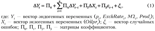 * Банк международных расчетов (Bank for International Settlements). ** Подробнее см.: www.platts.com/AboutPlattsHome. Источник: расчеты авторов. Для исследования рядов на стационарность и определения порядка интегрированности используемых рядов применяются тесты Дики-Фуллера и Филлипса-Перрона. В целом результаты тестов совпадают практически для всех исследуемых временных рядов. Исключение составляют показатели BCPIt и NGPIt, для которых результаты тестов расходятся: тест Дики-Фуллера в ряде случаев позволяет отвергнуть гипотезу о наличии единичного корня, а тест Филлипса-Перрона для ряда спецификаций показывает противоположные результаты. Для сохранения последовательности используемой в дальнейшем методологии оценивания мы считаем вышеуказанные временные ряды интегрированными первого порядка. Следовательно, возможно существование коинтеграционных соотношений с участием всех этих переменных. Для проверки наличия коинтеграционных соотношений используется тест Йохансена. Его результаты демонстрируют наличие в используемых данных нескольких (в зависимости от конкретной рассматриваемой спецификации теста) коинтеграционных соотношений. Векторная модель коррекции ошибок позволяет учесть такую коинтеграцию в данных. Спецификация векторной модели коррекции ошибок, которая будет использоваться для получения оценок, имеет вид: