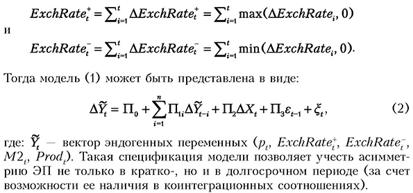 Все переменные представлены в логарифмах, а в качестве εt-1 обозначены лагированные остатки коинтеграционного соотношения. В случае наличия более одного коинтеграционного соотношения в оцениваемую спецификацию модели добавляются векторы остатков для обнаруженных дополнительных коинтеграционных соотношений. Таким образом, для каждой из пяти зависимых переменных, соответствующих разным индексам цен, проводится оценка модели с использованием каждой из трех переменных, отражающих обменный курс рубля. При оценке моделей переменная Oilprt рассматривалась как экзогенная, поскольку уровень цен на нефть определяется на мировом рынке и не может быть подвержен влиянию других используемых переменных. Остальные переменные рассматривались в качестве эндогенных, поскольку в той или иной степени влияют друг на друга. Для моделирования асимметрии эффекта переноса из общей выборки выделяются наблюдения, которые соответствуют повышению и снижению обменного курса. В качестве ExchRate+ обозначен ряд положительных частичных сумм, соответствующих периодам укрепления рубля, а в качестве ExchRate- — ряд отрицательных частичных сумм, соответствующих периодам его ослабления. Подробнее выражения для этих рядов могут быть записаны в виде: