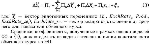 Источник: расчеты авторов. Влияние волатильности показателя обменного курса на величину ЭП исследуется посредством оценки модели (3). Отличие получаемых оценок от результатов модели (1) позволяет определить степень и характер влияния волатильности обменного курса на величину ЭП (табл. 5). Таблица 5 Результаты оценки влияния волатильности обменного курса на ЭП (краткосрочная эластичность уровня цен по обменному курсу)