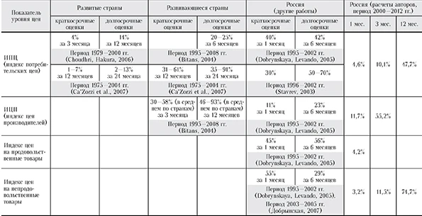 a Краткосрочная и накопленная эластичность уровня цен по обменному курсу. б Краткосрочная эластичность уровня цен по обменному курсу при укреплении и ослаблении национальной валюты. Примечание. Здесь и далее в таблицах оценки, кроме отмеченных * (статистически незначимы на уровне 10%), значимы на уровне 5%. Источник: расчеты авторов. Представленные в таблице 2 результаты показывают, что в краткосрочном периоде (один месяц) гипотеза об отсутствии эффекта переноса колебаний обменного курса на цены отвергается на уровне значимости 5% практически для всех комбинаций используемых ценовых индексов и переменных, отражающих обменный курс. Другими словами, в краткосрочном периоде наблюдается значимый эффект переноса. Анализ асимметрии ЭП проводился посредством оценки модели (2), в которой используются переменные, отражающие укрепление и ослабление национальной валюты. Гипотеза о равенстве ЭП для различных ценовых индексов отвергается. Гипотеза о наличии полного ЭП3 отвергается для всех комбинаций ценовых индексов и показателей обменного курса. Оценка ЭП для индекса потребительских цен (ИПЦ) составляет 4,6% в первый месяц. ИПЦ слабо реагирует на изменения обменного курса, изменения в первые три месяца составляют около 10,1%, за шесть месяцев — 28,1%. За год изменения ИПЦ, вызванные изменением номинального эффективного обменного курса рубля, достигают 47,7%. Полученные оценки ЭП для обменного курса рубля к доллару США и к евро практически одинаковы в краткосрочном периоде (составляют 2,8 и 2,9% соответственно). Однако со временем ЭП для обменного курса рубля к доллару накапливается быстрее, и в итоге накопленная величина ЭП за 12 месяцев для этого показателя составляет около 85,5%, а для обменного курса рубля к евро — 57%. Согласно результатам таблицы 2, гипотеза об отсутствии асимметрии ЭП отвергается практически для всех рассмотренных индексов цен. Другими словами, цены (различные индексы цен) реагируют на укрепление и ослабление национальной валюты по-разному. Можно видеть, что при ослаблении курса рубля ЭП выше (практически для всех спецификаций), чем на всем рассматриваемом периоде. При укреплении рубля оценки ЭП положительны практически для всех комбинаций ценовых индексов и переменных обменного курса. Следовательно, при укреплении рубля уровень цен растет, но медленнее, чем при его ослаблении. В таблице 3 наши оценки базовой модели ЭП сравниваются с полученными другими авторами. Можно видеть, что они не противоречат результатам работ, в которых исследован ЭП в странах с низким и средним уровнем инфляции (например, см.: Choudhri, Hakura, 2006; Ca'Zorzi et al., 2007). Согласно нашим оценкам, ЭП значительно снизился по сравнению с периодом до 2000 г. Отметим, что полученные нами оценки величины ЭП за 1 2 месяцев все же несколько превышают аналогичные оценки для развитых стран. Результаты проведенных тестов Зивота-Эндрюса на наличие структурных сдвигов говорят о том, что они происходили в августе — сентябре 2008 и январе-феврале 2009 г. (в целом совпадают с границами подвыборок, на которые были разделены все наблюдения). Таблица 3 Сравнение полученных результатов оценки ЭП с результатами, полученными в других работах