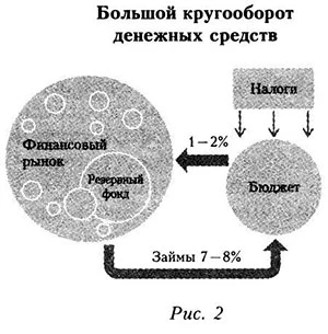 Источник: рассчитано по: Международные резервы Российской Федерации / Банк России, www.cbr.ru/hd_base/mrrf/. Наоборот, с 01.01.2009 по 01.01.2010 г. золотовалютные резервы выросли на 13,2 млрд долл., а за 2010 г., когда также имел место дефицит бюджета, они увеличились на 39,9 млрд долл. Подобная динамика золотовалютных резервов и показателей дефицита бюджета доказывает, что не было фактического расходования средств Резервного фонда и ФНБ как части золотовалютных резервов для финансирования дефицита бюджета. В посткризисный период страна перешла от практики профицитного бюджета к дефицитно-профицитному, когда одновременно осуществляются пополнение Резервного фонда и ФНБ и заимствования. В итоге за 2011—2012 гг. государственный долг вырос на 2091,7 млрд руб., а прирост Резервного фонда и ФНБ составил 1823,3 млрд руб.1 Следствия из профицитно-дефицитного бюджета такие же, как из профицитного. Кроме того, имеются и все недостатки экономики с дефицитным бюджетом: рост долга и расходов на его обслуживание. Так, если в 2007 г. расходы на обслуживание долга примерно равнялись доходам от размещения средств Стабфонда (143,1 млрд против 151,9 млрд руб.), то в 2012 г. первые почти в 6 раз превысили доходы от размещения средств Резервного фонда и ФНБ (подробнее см.: Дмитриева, 2013а). Дефицитно-профицитный бюджет формирует первый и главный кругооборот финансовых ресурсов — так называемый «большой кругооборот денежных средств» (см. рис. 2): налоги поступают в федеральный бюджет, затем зачисляются в Резервный фонд и ФНБ, их средства вкладываются в ценные бумаги иностранных государств под 1,12—1,95%2, одновременно осуществляются займы под 7—8%, средства от которых поступают в бюджет.