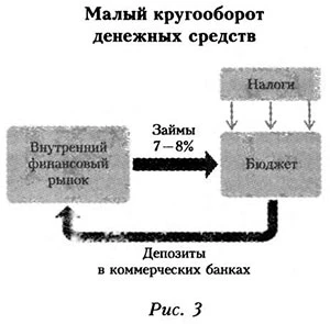 Чтобы оценить величину последних, рассмотрим кругооборот по операциям. Его размер можно оценить так: объем пополнения Резервного фонда в год + объем чистых заимствований + расходы на обслуживание долга + доходы от размещения средств Резервногс фонда. Самая оптимистичная оценка этих потерь равна 10% потоков, следовательно, объем накладных расходов и потерь составлял в последние годы от 250 млрд до 400 млрд руб. в год. Малый кругооборот денежных средств затрагивает толькс внутренний финансовый рынок (см. рис. 3). Налоги поступаю! в бюджет — профицит бюджета в виде временных остатков средств, который имеет постоянный характер, размещается на депозиты в коммерческих банках — далее государство осуществляет заимствования под 7—8%, средства от которых поступают в бюджет. Объем бюджетных средств, размещенных в коммерческих банках, составлял от 387 млрд руб. в 2010 г. до 2189 млрд руб. в 2011 г. Средневзвешенная ставка по депозитам в коммерческих банках — 5,88% при доходности по ОФЗ 7,2 —8,3%3. Исходя из того, что средневзвешенный остаток средств в банках примерно равен 500 млрд руб., потери на процентах составляют около 10 млрд, а упущенная макроэкономическая выгода — 300 млрд руб. Потери, риски, коррупция и накладные расходы по этому кругообороту оцениваются на уровне 30—50 млрд руб. Таким образом, совокупные потери от малого кругооборота денежных средств составляют 340—360 млрд руб.