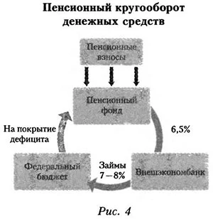 Источники: рассчитано по: Федеральный закон «О бюджете Пенсионного фонда Российской Федерации» на 2012 и 2013 гг.; Федеральный закон «Об исполнении бюджета Пенсионного фонда Российской Федерации» за 2009—2011 гг.; Горячева, Дмитриева, 2010. После изменения законодательства, начиная с 2010 г., все отчисления от социальных взносов поступают непосредственно в ПФР, и размер его фактического дефицита оценивается как разность между фактическими расходами на выплату трудовых пенсий и поступлениями от социальных взносов, которые идут на выплату пенсий. К основным направлениям фактического дотирования ПФР по выплате трудовых пенсий относятся: компенсация выпадающих доходов его бюджета в части установления пониженных тарифов страховых взносов для малых, инновационных, сельхозпредприятий; компенсация расходов на валоризацию; прямые трансферты на покрытие дефицита ПФР. Таким образом, в 2012 и 2013 гг. фактический совокупный дефицит ПФР был в 2 раза выше, чем официально объявленный. При этом на У3 он обусловлен отчислениями на накопительную часть пенсий. Свыше 75% средств пенсионных накоплений размещается через ВЭБ. На 1 января 2012 г. из 1555 млрд руб., переданных всем управляющим компаниям, ВЭБ получил 1164 млрд. При этом свыше 70% портфеля ВЭБ по пенсионным накоплениям составляют государственные ценные бумаги4. Кругооборот пенсионных денежных средств представлен на рисунке 4. Размер пенсионного кругооборота между ПФР, финансовым рынком и федеральным бюджетом складывается из суммы отчислений на накопительную часть пенсии; суммы финансирования дефицита бюджета ПФР, который вызван оттоком средств на накопительную часть пенсий; доходности по пенсионным накоплениям; доходности по государственным ценным бумагам, в которые вложены пенсионные накопления. Объем данного кругооборота можно приблизительно оценить в 1300 — 1350 млрд руб. ежегодно в условиях 2012—2013 гг. Прямые потери на процентах — это разность между доходностью по государственным ценным бумагам и приведенным к годовому исчислению ростом рыночной стоимости портфелей, в которых размещены пенсионные накопления. Так, рыночная стоимость расширенного инвестиционного портфеля ГУК «Внешэкономбанк» выросла за четыре года на 14%5, соответственно среднегодовой прирост составил 1,033. Следовательно, только за счет этого фактора прямые потери достигают 18 млрд руб. Упущенная макроэкономическая выгода составляет около 200 млрд руб.; накладные расходы — расходы управляющих компаний, НПФ, услуги депозитария, расходы Пенсионного фонда по учету средств, а также коррупция и риски достигают 10% оборота ежегодно, то есть 130—135 млрд руб. Здесь на первый план выходят финансовые риски — возможность получить отрицательную доходность по пенсионным накоплениям.