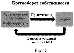 Кругооборот собственности, или приватизационный кругооборот, можно определить следующим образом. Средства от приватизации предприятий поступают в бюджет, при этом из него осуществляют взносы в уставные капиталы недавно акционированных предприятий (см. рис. 5).