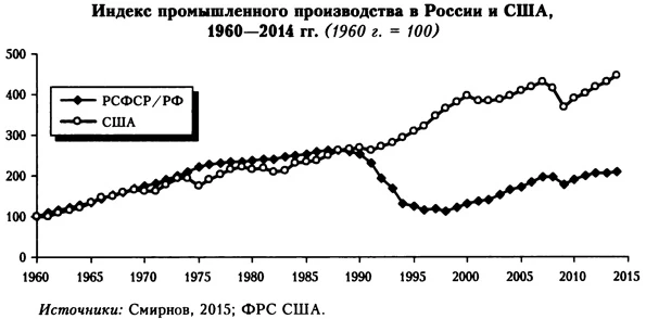 Сильная девальвация рубля, произошедшая к конце 1998 — начале 1999 г., породила процесс импортозамещения, который способствовал оживлению российской экономики в 1999-2000 гг. Позднее она росла благодаря быстрому повышению цен на нефть и увеличению физических объемов ее экспорта. С 2004 г. основным драйвером российской экономики стал спрос со стороны домохозяйств, связанный с быстрым ростом личных доходов, а также с развитием потребительского кредитования. В 2007 г. цены на нефть были уже около 80-90 долл./барр., а потребительский спрос рос на 10-12% в год. Очевидная зависимость российской экономики от бурного роста цен на нефть и необеспеченных потребительских кредитов позволяла выдвинуть гипотезу о «перегреве» российской экономики. Резкое сокращение товарно-материальных запасов в ходе кризиса 2008-2009 гг. показало, что он действительно имел место. С конца 2007 г., когда на мировых финансовых рынках проявились первые признаки турбулентности, и до сентября 2008 г. у многих была иллюзия, что российская экономика с ее огромными (более 500 млрд долл.) и продолжающими расти валютными резервами, профицитным бюджетом, при ценах на нефть свыше 100 долл./барр. должна выдержать захвативший мировую экономику «шторм» и остаться на плаву. Однако трехкратное падение цен на нефть (до 38 долл./барр. в декабре 2008 г.), значительный отток капитала, «отключение» многих российских банков и компаний от мировых финансовых рынков разрушили эту наивную мечту. «Перегрев» потребительского спроса и недостаточно умелое управление товарно-материальными запасами привели к серьезному спаду производства. В 2009 г. реальный ВВП упал на 7,8%, промышленное производство — на 9,3, ввод жилья строительными организациями — на 14,6, железнодорожные грузоперевозки — на 15% (после падения на 3% в 2008 г.)23. После завершения восстановительного подъема в 2010-2011 гг. стало ясно, что старая модель роста экономики России, основанная на высоких и постоянно растущих ценах на нефть, исчерпала себя. Хотя добыча нефти и мировые цены на нее оставались на высоком уровне, они уже не могли служить драйвером для российской экономики. Отток капитала по-прежнему был сильным, а конкурентоспособность отечественной продукции (кроме сырой нефти и иного сырья) — низкой; многие региональные бюджеты сводились с заметным дефицитом; в активах коммерческих банков накапливалось все больше безнадежных долгов; (неэффективные) госкомпании стали играть неоправданно важную роль в экономике; инфляция оставалась достаточно высокой (6-8% в год), что удерживало Банк России от снижения процентных ставок; инвестиционный климат для частного предпринимательства (как отечественного, так и зарубежного) становился все хуже и т. д. В результате в 2012-2013 гг. российская экономика пребывала в состоянии длительной стагнации. С весны 2014 г. западные финансовые санкции, связанные с украинским кризисом, последовавшие российские контрсанкции и — несколько месяцев спустя — обвал цен на нефть до 50-60 долл./барр. поставили российскую экономику на порог новой рецессии (или, скорее, стагфляции, поскольку инфляция достигла 15-17% к уровню прошлого года). Большинство экспертов предсказывают падение реального ВВП России на 3-5% в 2015 г. Вряд ли он упадет сильнее, поскольку сейчас в экономике нет огромных накопленных товарно-материальных запасов. Но до возобновления в Рос