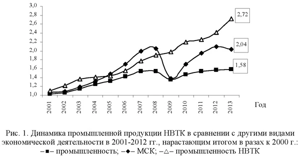 В контексте данного исследования рассмотрим только «ядро» НВТК, включающее ОПК и АТП1. Динамика развития и основные источники финансирования НВТКНа протяжении последних 15 лет НВТК оставался одним из наиболее быстроразвивающихся сегментов российской экономики, сохраняя очень высокую динамику развития даже в кризисные 2008-2009 гг. В 2001-2012 гг. объем валового выпуска промышленного сектора российского НВТК увеличился более чем в 2,4 раза. В сравнении с ним объем выпуска всего машиностроительного комплекса возрос не более чем в 2,1 раза, а промышленности - только в 1,6 раза. Среднегодовые темпы роста промышленной продукции НВТК за этот период составляли около 8%, по сравнению с 3,9% роста общепромышленных производств. При этом промышленный сектор НВТК генерировал по состоянию на конец 2013 г. примерно 4% ВДС общего объема ВВП РФ. Для сравнения: удельная доля вида экономической деятельности «добыча полезных ископаемых» в ВДС РФ в основных ценах составляет почти 10,9% [9]. Несмотря на это, на сегодняшний день место и роль НВТК в экономике России определяются не столько его удельным весом в промышленности, сколько научно-техническим потенциалом, сосредоточенным в организациях комплекса. Данные о динамике промышленности НВТК в 2000-е годы в сравнении со всей российской промышленностью и машиностроительным комплексом (МСК)2 показаны на рис. 1 .