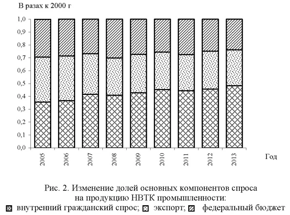 Относительные доли этих компонентов спроса (рис. 2) показывают достаточно устойчивую тенденцию увеличения удельного веса продукции, произведенной предприятиями НВТК при финансировании (прямом или косвенном) государства и соответственно снижения доли продукции, произведенной на экспорт.