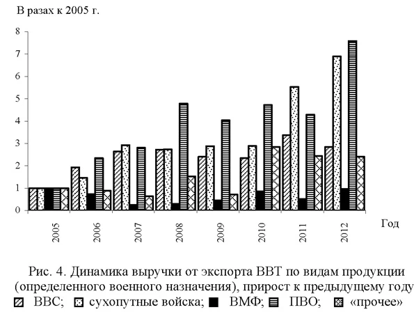 Значительное увеличение удельной доли промышленности обычных вооружений в общем объеме выручки от экспортных контрактов в 2011-2012 гг. объясняется резким ростом поставок на экспорт техники и вооружений для сухопутных войск. Общий объем выручки от этой статьи экспорта за 2005-2012 гг. возрос почти в семь раз. Если в 2005 г. иностранным заказчикам было поставлено только 2 танка и 109 бронемашин, то в 2012 г. в рамках экспортных контрактов были поставлены 128 танков, 276 бронемашин и 94 артиллерийских установки. Всего в 2005-2012 гг. экспорт составил 648 танков, 1082 бронемашины и 314 артиллерийских комплекса [17]. Кроме того в анализируемый период (рис. 4) также очень высокими темпами росла выручка от продажи комплексов противовоздушной обороны (более чем в 7,6 раза за 2005-2012 гг.). Поставки на экспорт (в натуральных показателях) ракет и ракетных пусковых установок (всех видов не только ПВО) возросли с 577 шт. в 2005 г. до более чем 16 тыс. шт. в 2012 г. Почти в три раза увеличился за 2005-2012 гг. объем выручки от поставок авиационной техники (с учетом комплексов вооружений). Всего, согласно данным ТС-ВПК, в 2005-2012 гг. на экспорт были отправлены 210 боевых самолетов и 314 боевых и военно-транспортных вертолетов [17]. Для динамики доходов от поставок военных кораблей характерны резкие колебания по годам в зависимости от авансирования и выплат по крупным контрактам. Такие контракты были реализованы в 2005 г. (поставлено иностранным заказчикам 7 боевых кораблей), в 2006 г. (2 боевых корабля), 2011 г. (5 кораблей) и 2012 г. (4 корабля). В остальное время доходы в этом сегменте в основном составляли авансовые платежи. Динамика роста валютной выручки от экспорта ВВТ по ключевым видам продукции приведена на рис. 4.