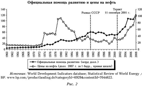 Все страны «экономического чуда» полагались именно на внутренние сбережения, а не на привлечение займов из-за границы (Krugman, 2009). Этот стилизованный факт должен еще получить свое объяснение. Проблема известна в литературе как «загадка Фелдстайна— Хориоки» (Feldstein—Horioka puzzle), она состоит в высокой положительной корреляции национальных инвестиций и сбережений: в странах с большими сбережениями инвестиции, как правило, крупные, и наоборот. Между тем в эпоху свободного и масштабного перемещения капитала между странами можно было ожидать противоположного — инвестиции в мировом хозяйстве должны были бы устремляться в страны с наивысшей отдачей независимо от уровня сбережений в них (Feldstein, Horioka, 1980). Помощь развитиюС указанным парадоксом связан и вопрос о помощи развитию: если международное финансирование дефицитов платежного баланса не ведет к быстрому экономическому росту, то надо ли предоставлять помощь развивающимся странам? Многочисленные исследования посвящены анализу эффективности помощи развитию (см. обзор: Channing et al., 2009). В некоторых сделан вывод, что помощь развивающимся странам не ведет к росту инвестиций, а инвестиции не способствуют ускорению роста (Easterly, 2001); в других — положительный эффект помощи явно ощутим; в ряде работ признано, что эффект есть, но он снижается по мере увеличения помощи из-за ограниченной абсорбционной способности экономики (Collier, 2006). Как бы то ни было, общий размер помощи развитию не настолько велик, чтобы считать ее ключевым фактором роста. В 2010—2011 гг. объем помощи составил немногим более 100 млрд долл., или всего 0,2% мирового ВВП. Более того, после распада СССР даже в номинальном выражении помощь не увеличивалась в течение десятилетия и начала расти только после 11 сентября 2001 г. (см. рис. 2).