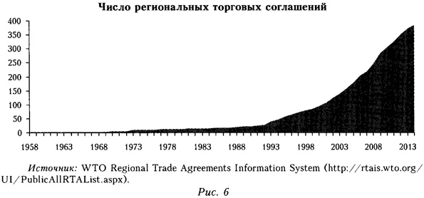 Темпы роста мировой торговли замедляются. Правда, при анализе ее ускорения в 2000-е и замедления в 2010-е годы важно учитывать ценовой фактор и эффект двойного счета. Иными словами, высокая динамика цен на сырьевые ресурсы могла искусственно завышать объем международной торговли. Кроме того, наблюдаемое в 2012-2013 гг. ее замедление скорее всего объясняется вялой динамикой спроса и ухудшением условий финансирования торговли. Несколько сокращается объем мировых прямых трансграничных инвестиций, однако это нельзя интерпретировать однозначно. Масштабный рост их потоков был одной из главных особенностей мирового экономического развития в конце 1990-х — 2000-е годы, источником ускоренного экономического роста в докризисное десятилетие. Сейчас, несмотря на высокую волатильность потоков инвестиций, они колеблются около достигнутого уровня: среднегодовой объем мировых прямых иностранных инвестиций (ПИИ) в 2005-2012 гг. составил около 1,5 трлн долл. Значимо меняется соотношение развитых и развивающихся стран как реципиентов в совокупном объеме инвестиций: если в 2000 г. на развивающиеся страны приходилось 20% всех мировых ПИИ, то в 2009 г. — 50, а в 2012 г. — 60%. В посткризисном периоде восстановились и даже выросли потоки инвестиций в развивающиеся страны Азии и Латинской Америки. Причем развитые страны остаются основным поставщиком иностранных инвестиций, хотя их доля сократилась с 90% в начале 2000-х годов до 65% в 2012 г., но по-прежнему доминирует. В то же время замедлилось трансграничное движение капитала между ведущими странами. Если в 2007 г. финансовые потоки между странами «большой двадцатки» составляли 18% их совокупного ВВП, то теперь этот показатель не достигает 4,5%, а во всей мировой экономике они сократились на 60% (Lund et al., 2013; Atkins, Fray, 2014). Разумеется, некоторые экономисты могут видеть в этом укрепление стабильности мировой экономики, что отражает известную дихотомию «стабильность, которая откладывает кризис, или рост, который его приближает». Однако ценой такой стабильности может стать долгосрочное торможение экономического развития. Отчетливо заметен «спрос» на протекционистскую политику и идеологию, правда не в грубой форме торговых запретов и высоких пошлин, противоречащих требованиям ВТО. Подобные меры, введенные в кризисный период, охватывают не более 5% объема мировой торговли. Однако гораздо большую роль начинают играть своего рода «разрешенные» барьеры в торговле — нетарифные, связанные с качественными ограничениями (фитосанитарные, экологические и т. п.). Новым трендом стала «регионализация глобализации» — рост количества соглашений о свободной торговле (рис. 6). Можно ожидать трансформации системы ВТО в направлении формирования «групп по интересам»: здесь возможен отход от единогласия как единственного принципа при формировании соглашений групп стран по отдельным вопросам, в том числе секторальным.