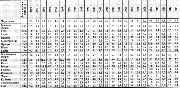Названные проблемы предполагают переосмысление теоретических основ современной экономической политики и общепринятых практических рекомендаций. На протяжении 1980-2000-х годов ее ключевым вопросом было обеспечение экономического роста и макроэкономической стабильности, а основными препятствиями на этом пути считали высокую инфляцию и избыточное государственное вмешательство. Подобное понимание задач и рисков получило концентрированное выражение в так называемом «Вашингтонском консенсусе» — своде базовых рекомендаций преимущественно для развивающихся стран (Williamson, 1989). Мы не отрицаем важности макроэкономической стабильности, но сегодня перед экономистами и политиками стоит задача найти дополнительные инструменты регулирования экономического развития, которые позволили бы избежать длительной стагнации на фоне низкой инфляции. Экономический рост и его стимулированиеВ докризисное десятилетие в мире наблюдались беспрецедентно высокие темпы роста, казавшиеся результатом обретенных экономико-политических инноваций, которые теперь будут действовать всегда. Это определяло нежелание денежных властей (особенно в США) сдерживать рост кредитования и тем самым замедлять перегрев экономики. Высокие темпы демонстрировали как развитые, так и развивающиеся страны. Теперь рост замедлился, в связи с чем возникает ряд вопросов. Та6лица 1 Темпы прироста ВВП в ведущих развитых и развивающихся странах по годам, 1990-2013 гг. (в %)