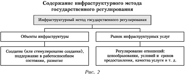 Инфраструктурный метод государственного регулирования направлен на создание объектов инфраструктуры и регулирование рынка инфраструктурных услуг (см. рис. 2) для развития общества в целом и экономики в частности. Создание производственной и социальной инфраструктуры традиционно относится к числу основных задач современного государства. Дискуссии об инфраструктуре нередко ограничиваются обсуждением развития транспортных систем. Однако для долговременного экономического роста сегодня требуются крупные инфраструктурные инвестиции в разные отрасли как производственной, так и социальной сферы. Начиная с 2000-х годов Китай инвестирует в инфраструктуру 8-10% ВВП, Индия — 4-6, а Россия — 1-2%8.