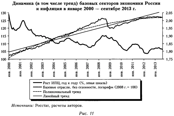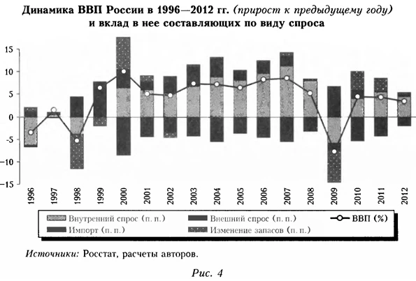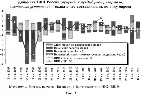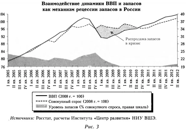 Впрочем, объективная оценка текущей ситуации затруднена из-за значительного статистического расхождения в официальных оценках динамики ВВП в первые два квартала 2013 г. по конечному спросу (см. рис. 1), что оставляет вопрос о факте рецессии открытым, как и вопрос о ее механизме. Говоря о последнем, отметим, что классическая кейнсианская концепция в той ее разновидности, которая объясняет циклические колебания экономики циклом запасов5, до сих пор хорошо подходила для объяснения двух главных российских рецессий (см. рис. 2)6, а другие потенциально плодотворные методологические подходы к анализу цикла и кризисной динамики в российской экономике пока активно не разрабатывают7. В целом доля кризисного падения российской экономики и в 1998, и в 2008-2009 гг., приходившаяся на фактор запасов, была больше, чем в ходе кризисов первой половины XX в. в США, которая там уменьшилась лишь с развитием логистики, технологий корпоративного управления и снижением инфляции.