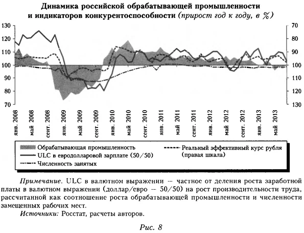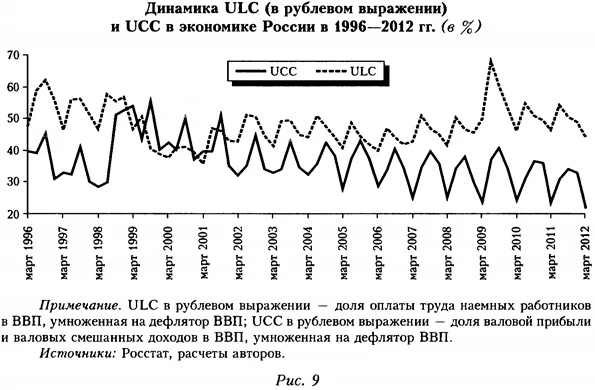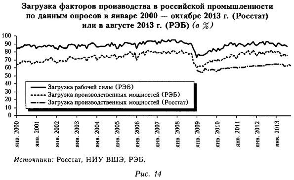 В связи с этим мы склонны согласиться с авторами (Gianella, Chanteloup, 2006), которые считают, что в России для борьбы с потенциальными рецессиями крайне важны структурные реформы на рынке труда с целью его демонополизации и более тесная связь динамики заработной платы в экономике с динамикой производительности труда. Последнее обусловит как антиинфляционный эффект, так и эффект поддержания ценовой конкурентоспособности российских товаров. Это особенно важно в условиях перехода к плавающему валютному курсу, когда именно стимулирующая денежно-кредитная политика может способствовать ускорению экономического роста. Такое положение существенно отличается от ситуации фактической фиксации валютного курса, как перед экономическим кризисом 2008—2009 гг., когда более эффективной в плане стимулирования совокупного выпуска была налогово-бюджетная политика. Но при возможном денежно-кредитном стимулировании в экономику надо встроить антиинфляционные «тормоза» и разработать систему индикаторов ее перегрева (см. ниже). В России рост удельных трудовых издержек вряд ли будет дальше компенсироваться параллельным снижением удельных капитальных издержек. По нашим оценкам, в отличие от европейских стран, в России рост UCC в 2000-е годы не наблюдался — они, наоборот, снижались (см. рис. 9). Но этот процесс не может длиться бесконечно, и его окончание, способствуя активизации инвестиционной активности, в то же время может стать новым затратным шоком для экономики21. В дополнение упомянем о таких внутренних для российской экономики шоках предложения, как мощный отток капитала из страны в 2011—2013 гг. и закрытие в 2012—2013 гг. значительного числа малых предприятий. Последнее может быть связано с возросшей налоговой и бюрократической нагрузкой, а также с общей проблемой стран с сырьевой экономикой — искажением конкуренции. Все названные факторы снижают конкурентоспособность и выступают внутренними шоками спроса и предложения, аккумуляция которых делает автономную рецессию в России на текущей стадии ее экономического развития весьма вероятной. К тому же в стране происходит смена модели экономического роста, что само по себе может вызывать его замедление22. Перегрета ли российская экономика, или О новом взгляде на проблему «разрыва выпуска»Из экономической теории известно, что если мощности загружены до предела или выше, то попытки стимулировать спрос, например, за счет ослабления денежно-кредитной политики, будут иметь чисто инфляционные последствия. В условиях российской экономики в такой ситуации инфляция издержек, генерируемая за счет роста удельных трудовых и капитальных затрат (последний связан с регулярной централизованной индексацией цен на продукцию естественных монополий), будет сопровождаться инфляцией спроса вне зависимости от того, насколько ожидаемы действия по смягчению денежно-кредитной политики. При обсуждении вопроса о возможном всплеске инфляции в российской экономике в случае, если правительство попытается стимулировать внутренний спрос, в 2013 г. не было единства. Сторонники стратегии стимулирования спроса говорили о том, что, по данным опросов предпринимателей, недостаток спроса находится на одном из первых мест среди факторов, ограничивающих экономический рост, и, значит, нехватки производственных мощностей нет. Однако 