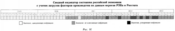 На основе полученных данных мы построили индикаторы, которые характеризуют состояние загрузки факторов производства в терминах поведения инфляции. На рисунке 15 видно, что экономика была недозагружена с начала исследуемого периода и до второй половины 2010 — начала 2011 г. Затем был период равновесного состояния, который, возможно (согласно лишь одному из трех опросов), в середине 2012 г. сменился вступлением экономики в стадию перегрева.