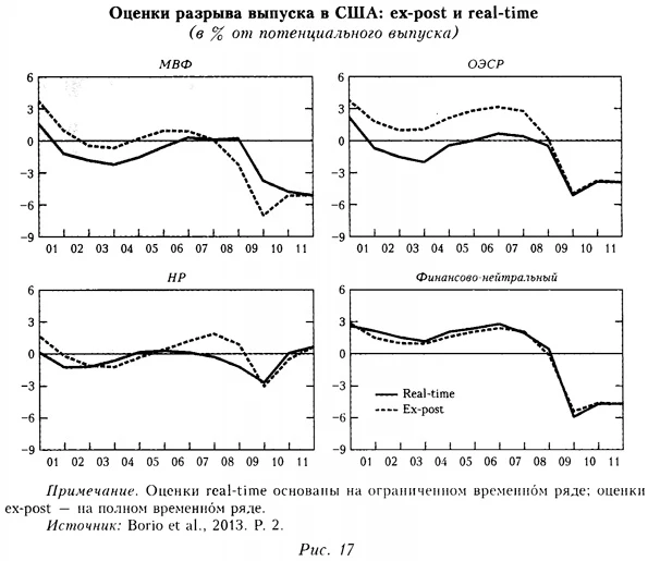 Поскольку результаты анализа опросов из разных источников отличаются, мы решили построить единый индикатор перегрева экономики. Методика его построения совпадает с описанной выше, за одним исключением: использована 90-процентная точность, а в случае расхождения данных из разных опросов окончательное значение индикатора мы брали по мажоритарному правилу30. Из данного индикатора (рис. 16) видно, что начиная с середины 2012 г. в течение большей части периода загрузка факторов производства либо превосходила равновесное значение (положительный разрыв выпуска), либо находилась на уровне равновесия (нулевой разрыв). Концепция выделения долгосрочной (устойчивой) и структурной составляющих ВВП (а также бюджета и безработицы), на основе которой и рассчитывается разрыв выпуска, после кризиса 2007—2009 гг., с одной стороны, подвергается критике в литературе, а с другой — продолжает использоваться на фоне попыток ее модернизации. Последняя нацелена на расширение спектра индикаторов разрыва выпуска для обеспечения либо их финансовой нейтральности (учета характеристик финансовых рынков наряду с традиционной увязкой показателей динамики выпуска и инфляции), либо нейтральности с учетом других особенностей национальной экономической модели (например, устойчивого перегрева на рынке труда и т. д.). Как отмечается в недавних работах, влияние финансов на цикл даже в США до сих пор фактически не учитывали ни в теории, ни на практике. Во-первых, финансовый сектор игнорировали, поскольку в своих решениях агенты финансового рынка опираются преимущественно не на открытую статистику, а на скрытую информацию (типа прогнозируемых выплат по активам или ожидаемых перспектив деятельности корпораций реального сектора экономики). Во-вторых, большую роль в таких важных для макроэкономики событиях, как банкротства банков, кредитные сжатия и образование пузырей на рынках активов, играют самосбывающиеся прогнозы, учитывать которые макроэкономисты пока полноценно не могут31. В-третьих, с середины 1980-х годов макроэкономисты на Западе делали акцент на новых моделях, основанных на структурных аспектах экономики, которые в определенной мере не были связаны с учетом действий фискальных и монетарных властей и с динамикой финансовых рынков32. ![]() В связи с этим сейчас в ходе дискуссий предлагают учитывать как сам по себе эффект финансового богатства (что влияет на потребление индивида, который тратит больше, если стоимость его финансовых активов растет33), так и неравномерность распределения этого богатства в ходе экономического цикла (в этом случае потери экономики с развитым рынком акций в ходе кризисов не сводятся к потерям текущего ВВП, а существенно превышают их). Кроме того, как считают некоторые участники обсуждений, важно учитывать влияние постоянного массированного перераспределения богатства между финансовыми рынками, а также воздействие этих рынков на структуру финансирования корпораций реального сектора (разделение между банковскими займами, облигациями и акциями) и на их эффективность34. При этом в экономической литературе все чаще отмечают, что трактовка потенциального выпуска как неинфляционного (выпуска при стабильной инфляции) игнорирует исторически подтвержденный факт: динамика выпуска может быть нестабильной и неустойчивой при низко