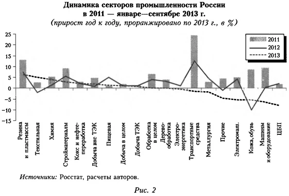 к. э. н., замдиректора Института «Центр развития» НИУ ВШЭ Канофьев В.А. стажер-исследователь Института «Центр развития» НИУ ВШЭ Проблема автономной рецессии в России как рецессии спроса или предложения (а не обычной для страны рецессии запасов)В 2013 г. в России, несмотря на стабилизацию экономической ситуации в мире, возникла дискуссия о возможности скорого вступления российской экономики в фазу рецессии. Причиной стало последовательное замедление темпов роста ВВП до 1,2% в III квартале 2013 г. по отношению к соответствующему периоду прошлого года (пик 5,1% зафиксирован в III квартале 2011 г.). При этом текущие данные (первая, предварительная, оценка Росстата) говорят об отставании в 2013 г. динамики производства от динамики спроса, то есть о частичном удовлетворении последнего за счет распродажи накопленных ранее запасов материальных оборотных средств1. В России такой сценарий нередко выступает предвестником кризиса (аналогичная ситуация была в III квартале 2008 г.), который, если ориентироваться на данные Росстата со снятой сезонностью2, уже наступил (рис. 1). На фоне замедления роста ВВП наиболее весомый вклад в последовательное снижение экономической активности в последние два года вносят промышленность в целом и обрабатывающие производства в ее составе3. Динамика выпуска секторов российской промышленности в 2013 г. продемонстрировала тотальное ухудшение вплоть до снижения почти в половине основных секторов, но наибольшее сокращение производства наблюдается именно в тех секторах обрабатывающей промышленности, которые, как показывает мировой опыт, наиболее синхронны с общеэкономической рецессией, в частности в металлургии и машиностроении4 (рис. 2).