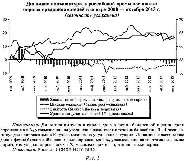 Сейчас кризис ликвидности, в отличие от 2008 г. (когда он случился на фоне резкого сжатия прироста денежной базы из-за негибкой модели формирования денежного предложения10), может быть связан с серьезным расслоением российской банковской системы по этому признаку. Говоря о кризисе неплатежеспособности, следует иметь в виду наличие определенных проблем в банковском секторе (о чем говорят специальные индикаторы11 и недавний отзыв ЦБ РФ лицензий у ряда российских банков), а также серьезное ухудшение в 2013 г. макроэкономической ситуации в странах БРИК. В целом все это свидетельствует о сохранении вероятности кризисного импульса на финансовом рынке, что может привести к включению отрицательного мультипликатора запасов и переходу стагнации в рецессию. Правда, к IV кварталу 2013 г. в промышленности России, если судить по опросам Росстата, вновь возник недостаток запасов готовой продукции (рис. 5). ![]() Если при анализе возможности новой рецессии в России исходить из теоретической модели цикла запасов и проводить аналогии с предшествующими кризисами, то можно сказать, что в 2008—2009 гг. события развивались по следующему сценарию. В предкризисный период в условиях высокой инфляции предприятия создали значительные запасы сырья, материалов и готовой продукции. Затем после резкого ухудшения в конце 2008 г. ожиданий на фоне ситуации своего рода «идеального шторма» на финансовых рынках8 они начали резко сокращать запасы, стремясь удержать их в соответствии с известными предпосылками используемой модели на уровне нормы (в процентном отношении) относительно ожидаемого объема продаж. Спрос в понижательной фазе конъюнктуры в 2009 г. практически не изменился, а около 3/4 падения ВВП (-7,9%) объяснялось отрицательным вкладом кратного сокращения запасов (рис. 3—4)9. Сегодня в российской экономике, как и в 2008 г., сохраняются некоторые условия для включения такого триггера процесса резкого снижения запасов, как потенциальное обострение ситуации на финансовом рынке в виде кризиса либо ликвидности (как в конце 2008 г.), либо неплатежеспособности финансовых институтов.