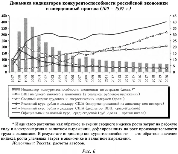 Данные Росстата о состоянии всех запасов поступают со значительным опозданием, поэтому нет оснований говорить об отсутствии угрозы рецессии в ближайшее время и тем более — в обозримой перспективе. Вопрос о наступлении в российской экономике не обычной для нее рецессии запасов (где преобладающий вклад в падение ВВП вносит их сокращение), а рецессии спроса или предложения, становится более актуальным с учетом двух факторов. Во-первых, это устойчивое торможение (или даже падение) темпов роста как внутреннего, так и внешнего спроса12. Во-вторых, «прокризисная» динамика рассчитываемого нами индекса конкурентоспособности российской экономики по уровню валютных издержек13, значение которого сейчас заметно ниже критического, при котором в России происходили кризисы 1998 и 2008-2009 гг. (рис. 6).