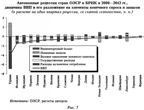 Примечание. Жирным шрифтом выделены важные торговые партнеры России — с долей во внешнеторговом обороте в 2012 г. более 4%. Источники: ОЭСР, расчеты авторов. Таким образом, с точки зрения мирового опыта наступление в той или иной экономике автономной рецессии не исключительное событие. При этом возникает вопрос о причинах этого явления. Анализ вклада факторов в динамику ВВП стран, где наблюдались автономные рецессии в 2000—2012 гг., показывает, что в странах ОЭСР и БРИК в целом подобная ситуация возникала при одновременном падении валового накопления и расходов на конечное потребление домашних хозяйств (рис. 7, табл. 2). Эти два фактора объясняли около 84% падения ВВП в ходе типичной автономной рецессии, из которых на фактор валового накопления приходится 51, а конечного потребления — 33%. Отрицательный вклад изменения запасов составлял около 14%, изменения внешнеторгового сальдо — 5, а вклад госрасходов был положительным — менее 3% падения ВВП, что неудивительно, учитывая их антициклический характер. Таким образом, опираясь на мировой опыт, можно сказать, что автономную рецессию в российской экономике следует ожидать при резком замедлении доходов домашних хозяйств, чего пока не наблюдается. Но этого нельзя исключать в силу длительного опережающего роста заработной платы (в валютном выражении) по сравнению с производительностью труда, что негативно влияет на конкурентоспособность производителей торгуемых товаров (конкурирующих с иностранными по критерию удельных издержек) и способствует формированию тенденции к сдерживанию роста заработной платы.