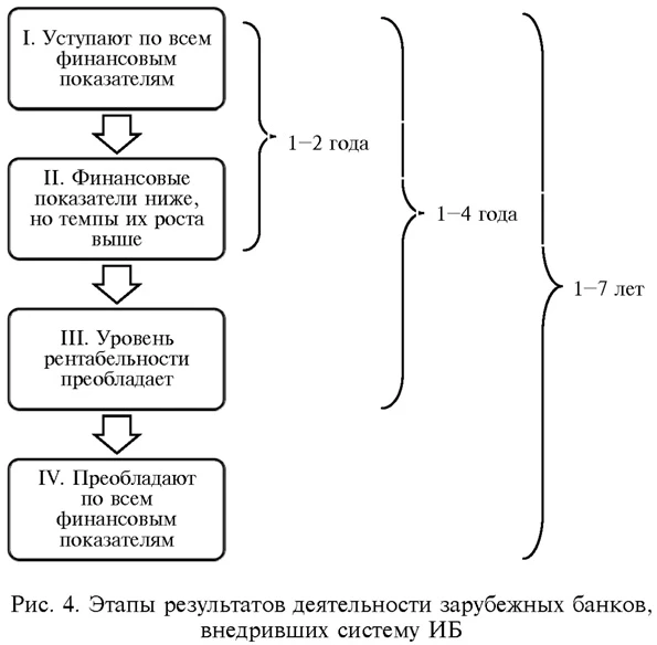 На первом этапе банки, внедрившие систему ИБ, уступают в показателях эффективности. Второй этап характеризуется тем, что финансовые показатели банков, внедривших систему ИБ, ниже, однако темпы их роста выше. На третьем этапе отмечается повышение уровня рентабельности банков, внедривших систему ИБ относительно банков, не предоставляющих дистанционных услуг. Заключительный этап характеризуется преобладанием всех финансовых показателей банка, применяющих ИБ. Это является положительным эффектом от внедрения ИБ как дополнительного источника банковского обслуживания. Этапы результатов деятельности коммерческих банков, внедривших сервис «Интернет-банкинг», проиллюстрированы на рис. 4.