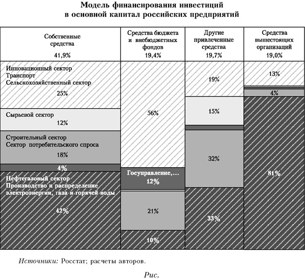 Источники: Росстат; расчеты авторов. Высокая эффективность инвестиционных вложений отмечается в секторах первой группы, нормальная — в секторах второй, низкая — в секторах третьей и четвертой групп. По итогам 2006—2011 гг. наименьшие инфляционные риски и максимальный стимулирующий эффект при реализации инвестиционных проектов были присущи инвестиционной активности в секторах, в которых формирование инвестиционных ресурсов в основном определялось централизованным финансированием со стороны вышестоящих организаций. Процесс становления в России экономики с сильным ТЭК и относительно развитыми транспортной инфраструктурой и сельским хозяйством и отчасти — инновационным сектором в значительной степени финансируется за счет ресурсов, аккумулируемых и привлекаемых вертикально интегрированными компаниями ТЭК, а также средств, предоставляемых государством непосредственно или формирующихся благодаря проведению соответствующей государственной политики. При этом для предприятий широкого круга видов экономической деятельности характерны низкая эффективность инвестиционных вложений, ограниченность ресурсов для инвестиций и, как следствие, торможение инвестиционной активности. При оценке возможностей активизации и/или целенаправленной модификации инвестиционного процесса в России необходимо учитывать своеобразие сложившейся к 2011 г. модели финансирования инвестиций в основной капитал. Модель финансирования инвестиций в основной капитал по секторам российской экономикиВ соответствии со сложившейся моделью примерно 42% инвестиций в основной капитал финансируется за счет собственных средств предприятий, а весь объем привлеченных для инвестиций средств состоит из трех сопоставимых частей (на каждую приходится примерно 1,6 трлн руб. по итогам 2011 г.):