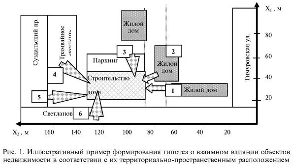 Перед проведением оценки вся территория с расположенными объектами недвижимости классифицируется по их основному назначению и определяется характер и интенсивность воздействия на i-е строение окружающих j объектов недвижимости в соответствии с расстоянием между ними, а также состоянием объекта в вершине i, т. е. gij = var (рис. 2).