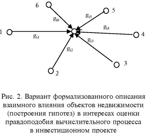 Определим основное содержание вычислений при оценке взаимного влияния объектов недвижимости. В качестве исходного положения при построении такой модели примем, что проведена следующая оценка взаимного влияния объектов недвижимости, представленных на рис. 1. ![]() Покажем вариант построения модели оценки правдоподобия информации, основанный на использовании взвешенного знакового орграфа. В такой модели объекты недвижимости представлены вершинами V = {v1, v2, ..., vn} орграфа, а дуги G = {gij} отражают их влияние друг на друга и на строящийся по инвестиционному проекту i-й объект недвижимости. Если на i-й объект недвижимости оказывает воздействие j-й объект, то между вершиной vi и вершиной vj орграфа проводится дуга, ориентация которой показана стрелкой. При назначении знаков каждой из дуг орграфа используем следующее правило: