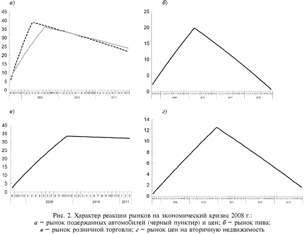 Наблюдаемая задержка реакции российских рынков на экономический кризис 2008 г. вызвала научный интерес и послужила темой данного исследования. В процессе исследования на данных каждого рынка строятся эконометрические модели [1], изучаются задержка реакции рынков на кризис и продолжительность этого состояния. Анализируется состояние следующих российских рынков: розничной торговли, пива, подержанных автомобилей, недвижимости. Для каждого из рынков строится модель, позволяющая количественно описать реакцию на экономический кризис 2008 г. Внешнее воздействие описывается функцией, которая предполагает монотонное возрастание эффекта кризиса и последующее монотонное убывание. Модель опирается на новый метод, использующий нейронные сети нестандартной архитектуры и предназначенный для количественного измерения эффекта влияния внешних событий (ВВС) [2]. Метод позволяет рассматривать гипотетическую ситуацию, в которой исключено ВВС. Таким образом, предполагается возможность моделирования показателей без ВВС для целей оценки потерь или выигрыша от внешнего воздействия. К основным результатам исследований можно отнести: