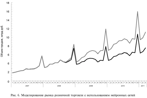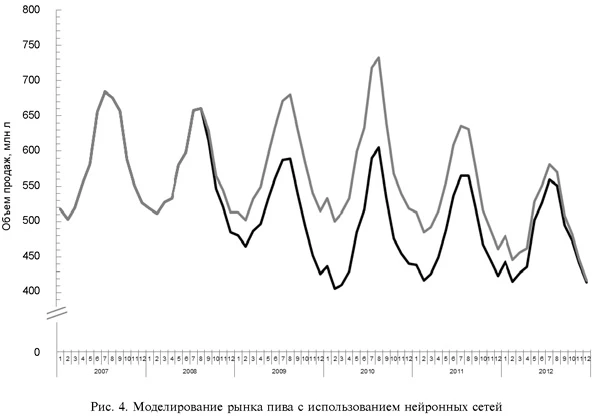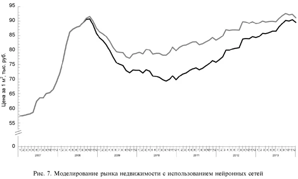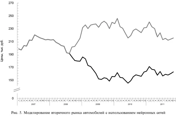Динамика рынков при отсутствии кризисаПредложенный инструмент позволяет исключить ВВС и смоделировать результаты деятельности для целей оценки потерь вследствие кризиса [17, 18]. На рис. 4-7 представлена динамика исследуемых рынков: черная линия отвечает за исходный ряд данных, серая сплошная линия — модель с использованием нейронных сетей. Рынок пива в период максимального воздействия кризиса потерял 19,9 % объема продаж. Совокупные потери рынка пива вследствие кризиса оцениваются в 3144 млн л, что составляет 11 % от общего объема продаж пива за время воздействия кризиса (рис. 4). ![]() Цены на вторичном рынке автомобилей в самый разгар кризиса оказались ниже на 36,2 % (рис. 5). ![]() Рынок розничной торговли демонстрирует несколько иные результаты: совокупные потери составили 69 млрд р., что составляет 28,1 % от общих объемов продаж рынка. В момент максимального воздействия кризиса потери составили 33,5 % (рис. 6). ![]() На рынке недвижимости в момент максимального воздействия кризиса цены упали на 12,5 % [19] (рис. 7). ![]() В табл. 2 представлены сравнительные характеристики процента потерь в разных отраслях экономики. Больше всего кризис затронул вторичный рынок автомобилей (потери составили 39 %), наименьшее воздействие кризиса — на рынок вторичной недвижимости (12,5 %). Таблица 2 Сравнение потерь в разгар кризиса в разных отраслях