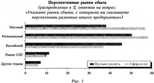 Базой для проведения обследования стали инструментарий (анкеты)8 и выборка предприятий обрабатывающей промышленности и сферы услуг, стратифицированная по видам экономической деятельности (на базе подразделов ОКВЭД) и размеру предприятий. Было обследовано 11 секторов добывающих производств9; пищевая, легкая промышленность; обработка древесины, производство изделий из дерева, бумаги, картона и изделий из них; издательская и полиграфическая деятельность; химия и нефтехимия; черная и цветная металлургия, обработка металла; производство машин и оборудования; приборостроение; автомобилестроение; транспортное машиностроение (кроме автомобилестроения); производство строительных материалов. В сфере услуг отбирались предприятия, занимающиеся транспортировкой и хранением грузов; оказывающие услуги в области электросвязи, использования вычислительной техники и информационных технологий, оптовой торговли и др. Место инновационной деятельности в общей конкурентной стратегии компании, как уже отмечалось, является важной характеристикой инновационных процессов, происходящих на микроуровне. Выборочное обследование позволило оценить, насколько предприятия связывают свой коммерческий успех с инновационной деятельностью. На базе специализированных опросов руководителей российских предприятий были выделены три индикатора, позволяющие исследовать данную взаимозависимость. Первые два аккумулируют субъективные оценки главных конкурентных преимуществ конкретных компаний, а также их мнение о других участниках рынка. Это позволяет понять, как руководители компаний позиционируют новизну продукции/услуг среди других приоритетов бизнес-стратегии. Третий индикатор дает информацию для выявления и анализа того, насколько значимым оказывается внедрение процессных и организационных инноваций для коммерческого успеха, а также для косвенной оценки потенциального спроса на технологическое обновление и реорганизацию производства (в разрезе рассматриваемых секторов). Инновации и конкурентная стратегия предприятий: оценка и использование конкурентных преимуществСегодня во всем мире в условиях глобализации и обострения конкуренции формирование и реализация четкой и, желательно, долгосрочной стратегии становятся актуальной потребностью существования компаний, признаком современной и эффективной модели создания и развития бизнеса. Причем речь идет не только о крупных или преуспевающих фирмах в развивающихся сегментах экономики, но и о малых предприятиях, старт-апах, а также предприятиях базовых отраслей, которые не могут жить по старинке (без оглядки на конкурентов и партнеров, за счет сложившихся практик, инерции, здравого смысла и общих представлений о том, как надо «делать бизнес»). Только долгосрочное стратегическое видение и активное подключение к различным сетевым взаимодействиям дает шанс для выживания и использования новых возможностей. Что происходит в данной области в России? Если не рассматривать отдельные предприятия, то в целом для всех отраслей обрабатывающей промышленности и сферы услуг абсолютно приоритетны три рынка — местный, региональный и российский. С большим отрывом от них располагаются рынки стран СНГ, других зарубежных государств (рис. 1). Причем, по субъективному представлению респонденто