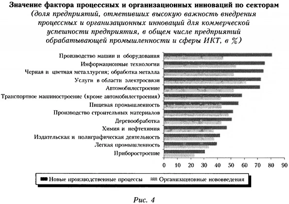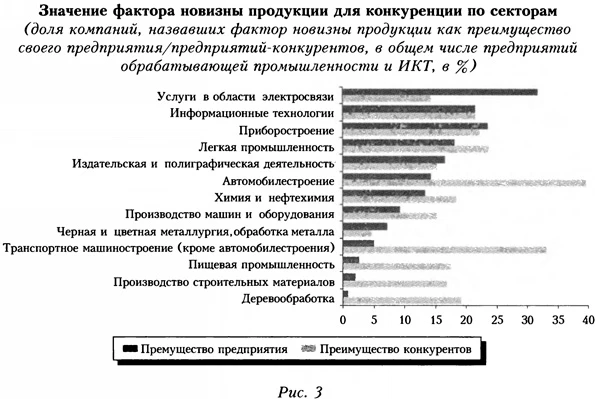 В восприятии руководителей предприятий фактор новизны продукции редко выделяется в качестве главного конкурентного преимущества (причем по отношению как к самим предприятиям, так и к их конкурентам), в основном подкрепляя другие характеристики качества продукции и бизнес-процессов. Оценки конкурентного давлени я демонстрируют, что технологическое превосходство продукции других участников рынка является основным сдерживающим фактором для 10% всех предприятий обрабатывающей промышленности и сектора ИКТ. Значение инновационного фактора в развитии компаний имеет ярко выраженную секторную специфику (рис. 3). Более 1/5 всех предприятий в области электросвязи, приборостроения и информационных технологий считают новизну продукции важным элементом бизнес-стратегии. В наименьшей степени полагаются на новизну производимой продукции предприятия пищевой промышленности, производства строительных материалов, деревообработки. Интересно отметить крайне низкие оценки значения такого преимущества в транспортном машиностроении, что говорит об общей негативной оценке собственного инновационного потенциала предприятиями данной отрасли.
